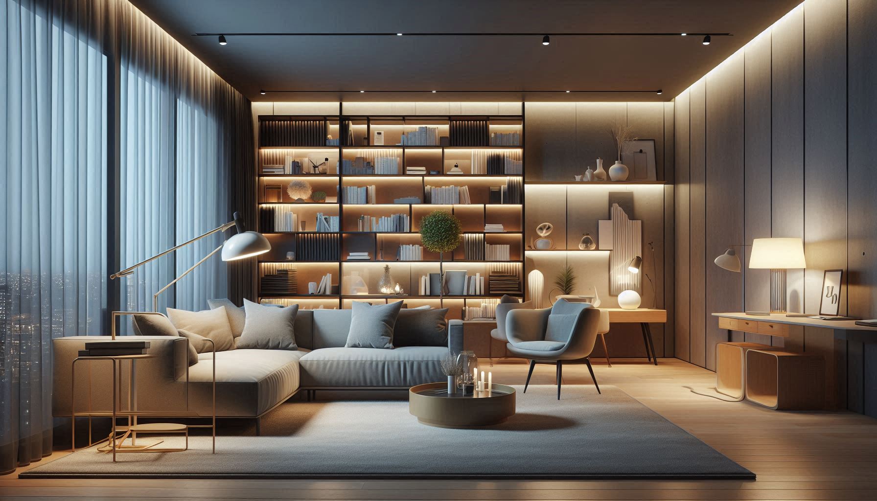 В современной гостиной то, как играет свет, определяет настроение. Единичного потолочного светильника недостаточно. Создайте уровни: мягкое общее освещение; локальные сценарии — торшер у кресла, бра для чтения, направленный свет на зону работы. Подсветка полок или встроенные LED скрытно формируют динамику.
