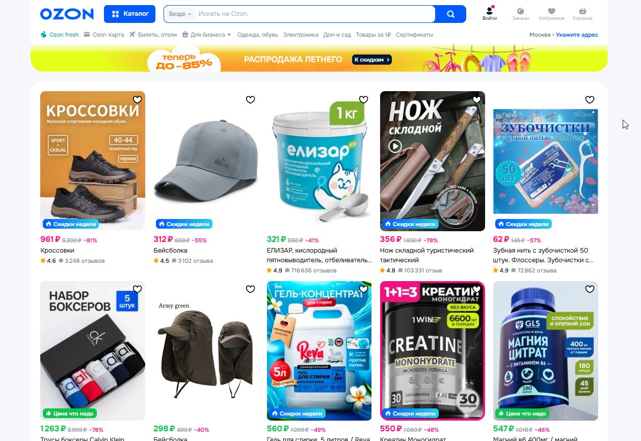 Ozon: меню, фильтры, поиск под рукой, всё очевидно и не вызывает вопросов: оформление заказа, быстрые отзывы, чаты поддержки и разделы сайта интегрированы в поток действий.
