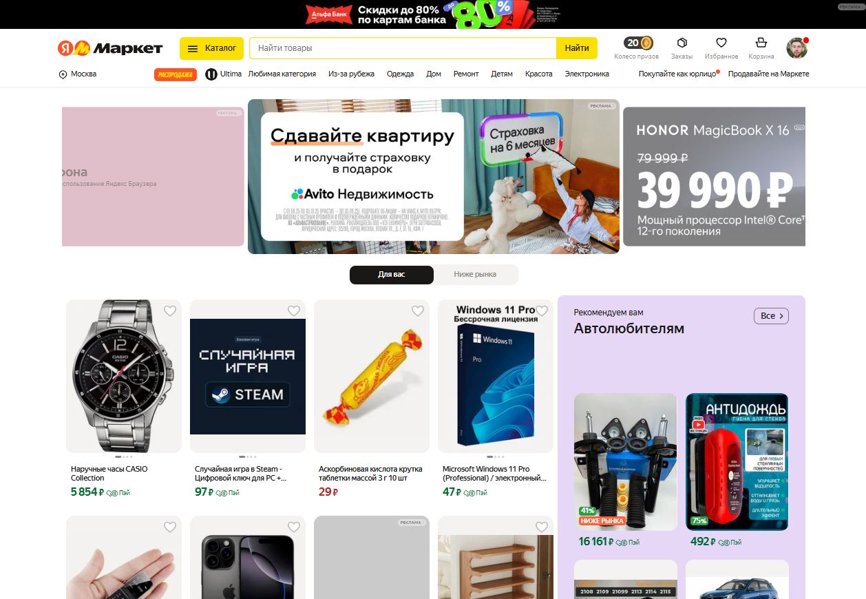 Яндекс.Маркет: уже на загрузке — шапка сайта и заметная строка поиска; разделы распределены как цепь сценариев, а быстрые фильтры экономят время. Карточки, корзина, CTA — всё работает сразу, обратная связь не требует поиска. Хлебные крошки ведут по глубине, исключая риск случайных переходов.