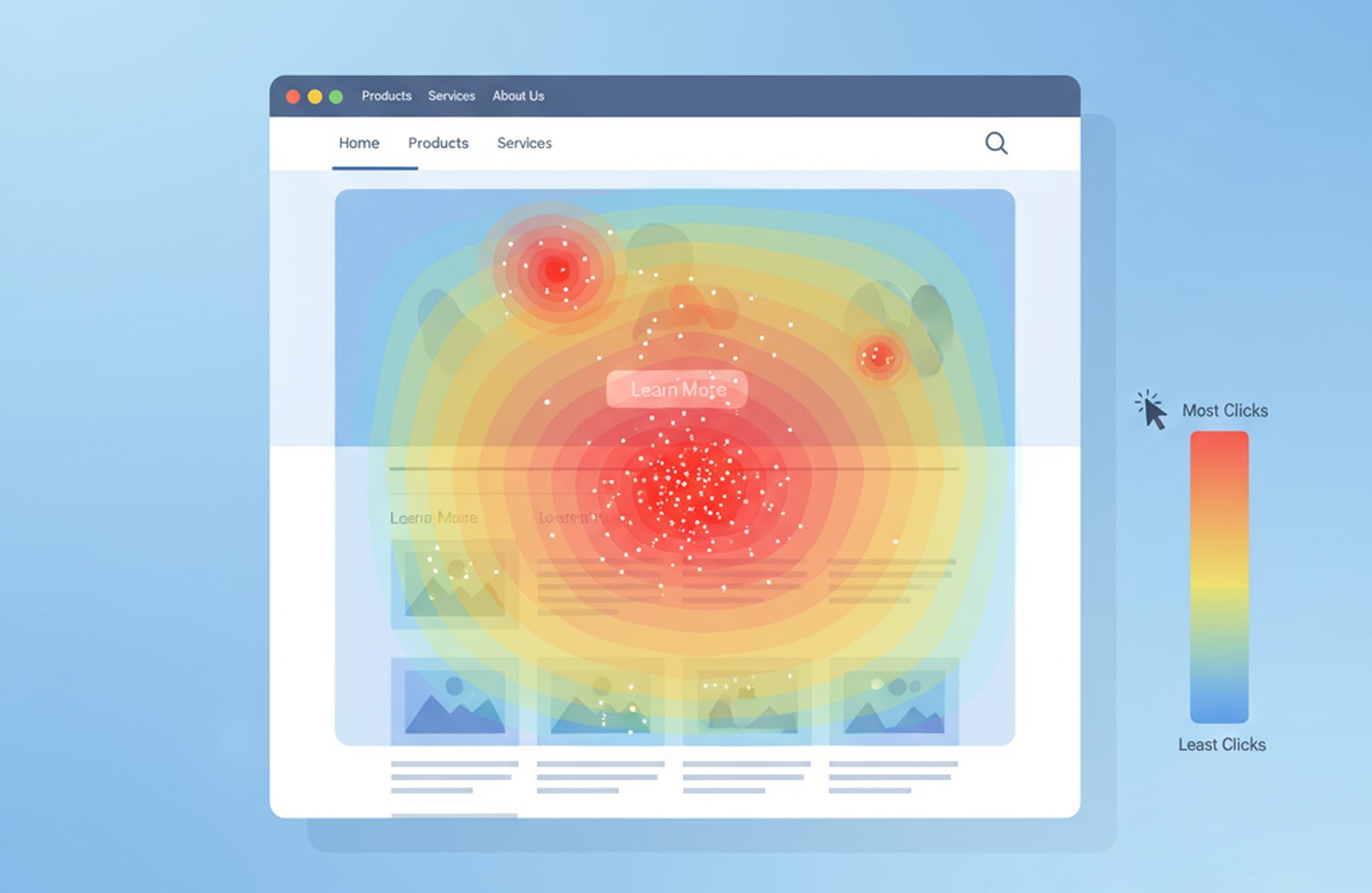 - Click-тесты и тепловые карты. UI тестирование выигрывает за счёт наглядной аналитики: видно, на какие части экрана приходится внимание. Карты движений дают много инсайтов даже в маленьких проектах.